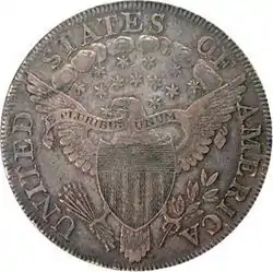 There are three basic reverse designs. The first, for copper coins, features the value of the coin (half cent or one cent) surrounded by a wreath or vine. The words "UNITED STATES OF AMERICA" encircle the wreath. In 1795-1797, a scrawny, naturalistic bald eagle was depicted on the reverse side of all silver coins. This design is known as Draped Bust, Small Eagle and usually commands a high price due to the extremely low mintage at the time. In 1798, the small eagle was replaced by the Heraldic eagle. This design is known as Draped Bust, Heraldic Eagle. The famous 1804 silver dollar has this design as well the reverse of the Kennedy half dollar in 1964. Three denominations also bore the appropriate fraction: half cent (1/200), large cent (1/100) and half dollar (1/2).