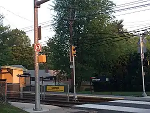 Drexelbrook station is a SEPTA Route 101 trolley stop in Drexel Hill, Pennsylvania. It is officially located near Stanbridge Road and Woodland Avenue in the Drexelbrook area, however the actual grade crossing and platforms are on Wildell Road south of Woodland Avenue and north of Revere Road and Drexelbrook Drive.