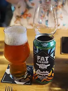 Most large companies serve their beverages in printed cans, where designs are printed on the aluminum and then crafted into a can. Alternatively, cans can be wrapped with a plastic design,[46] mimicking the printed can but allowing for more flexibility than printed cans.[47] A modern-day trend in craft alcohol is to design stickers to put on cans, allowing for smaller batches and quick changes for new flavors.[48]