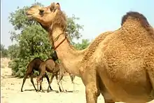 The dromedary (Camelus dromedarius UK: /ˈdrʌmɪdəri, ˈdrɒm-/ or US: /-ˌdɛri/;[2][3]), also known as the dromedary camel, Arabian camel,[4] or one-humped camel, is a large even-toed ungulate, of the genus Camelus, with one hump on its back.