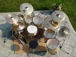 A Drum Set (also called a drum set,[lower-alpha 1] trap set, or simply drums) is a collection of drums, cymbals, and sometimes other auxiliary percussion instruments set up to be played by one person.[1] The player (drummer) typically holds a pair of matching drumsticks, one in each hand, and uses their feet to operate a foot-controlled hi-hat and bass drum pedal.