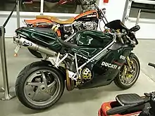 A 2001 Ducati 996, in dark green, was featured in the 2003 movie The Matrix Reloaded.[3] Ducati subsequently announced a limited edition of similar bikes for model year 2004 in a very dark green color, but as production of the 996 had since ceased, these were actually 998-series bikes.