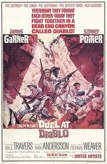Duel at Diablo is a 1966 American Western film starring James Garner in his first Western after leaving the long-running tv series Maverick, as well as Sidney Poitier in his first ever Western. Based on Marvin H. Albert's 1957 novel Apache Rising, the film was co-written by Albert and Michael M. Grilikhes; it was directed by Ralph Nelson, who had directed Poitier in Lilies of the Field. The supporting cast includes Bibi Andersson, Bill Travers, Dennis Weaver and John Hoyt; Ralph Nelson has a cameo as an Army Major. The movie was shot on location amidst striking scenery in southern Utah; the musical score was composed by Neal Hefti.