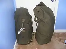 A duffel bag, duffle bag,[1][2] or kit bag is a large bag made of either natural or synthetic fabric (typically canvas), historically with a top closure using a drawstring.[3] Generally a duffel bag is used by non-commissioned personnel in the military, and for travel, sports and recreation by civilians.[4] When used by a sailor or marines a duffel is known as a seabag. A duffel's open structure and lack of rigidity makes it adaptable to carrying sports gear and similar bulky objects.