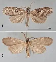 The length of the forewings is 11.2–12.2 mm. The forewing dorsal ground color is a mixture of gray-brown, reddish-brown, and beige-colored scales. The veins are lined with gray, especially distally. The anal fold and cubitus are reddish brown and the orbicular spot is diffuse reddish brown. The reniform spot is small and reddish brown. The ventral surfaces of both wings are gray brown. The dorsal hindwing is dirty gray brown, but lighter near base.