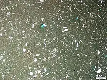 Thin section photomicrograph of a fragmented bioclast wackestone in plane polarised light.