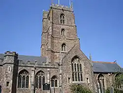 The first church in Dunster was built by William de Mohun who gave the church and the tithes of several manors and two fisheries, to the Benedictine Abbey at Bath. The priory, which was situated just north of the church, became a cell of the abbey.[1] The church was shared for worship by the monks and the parishioners, however this led to several conflicts between them. One outcome was the carved rood screen which divided the church in two with the parish using the west chancel and the monks the east.[2] The priory church is now in parochial use as the Priory Church of St George which still contains 12th and 13th century work, although most of the current building is from the 15th century. It has been designated as a Grade I listed building.[3][4]