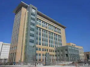 The Durham County Justice Center is a civic building in downtown Durham, North Carolina. The $120 million building opened to the public in February 2013.[1] The building houses the Durham County Sheriff's Office, the Durham County District Attorney's Office, and has 20 courtrooms.[1] The building is 318,533 square feet and was built to LEED Gold Standards.[2][3] The Justice Center was built with sustainable materials and includes lawns on its roofs for insulation and to capture runoff. It is one of the tallest buildings in Durham and dominates the downtown skyline from NC 147.