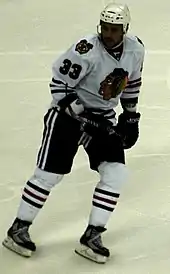Dustin Byfuglien (/ˈbʌflɪn/ BUFF-lin;[1] born March 27, 1985) is an American former professional ice hockey player. He previously played for the Chicago Blackhawks, Atlanta Thrashers and Winnipeg Jets. Drafted as a defenseman, he has played both forward and defense in his career, although he generally played defense in his later seasons. Byfuglien helped Chicago win the Stanley Cup in 2010. Byfuglien is the first black American-born player to win the Stanley Cup.[2]
