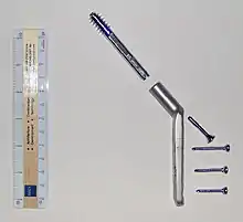 Dynamic hip screw (DHS) or Sliding Screw Fixation is a type of orthopaedic implant designed for fixation of certain types of hip fractures which allows controlled dynamic sliding of the femoral head component along the construct. It is the most commonly used implant for extracapsular fractures of the hip,[1] which are common in older osteoporotic patients. There are 3 components of a dynamic hip screw, including a lag screw (inserted into the neck of the femur), a sideplate and several cortical screws (fixated into the proximal femoral shaft). The idea behind the dynamic compression is that the femoral head component is allowed to move along one plane; since bone responds to dynamic stresses, the native femur may undergo primary healing: cells join along boundaries, resulting in a robust joint requiring no remodeling.
