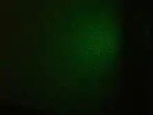 A monochromatic light source, usually a laser, is shot through a polarizer and into a sample. The scattered light then goes through a second polarizer where it is collected by a photomultiplier and the resulting image is projected onto a screen. This is known as a speckle pattern (Figure 1).[4]