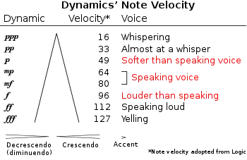 Note Velocity is a MIDI measurement of the speed that the key travels from its rest position to completely depressed, with 127, the largest value in a 7-bit number, being instantaneous, and meaning as strong as possible. Play a C major chord at each dynamic from fff to ppp