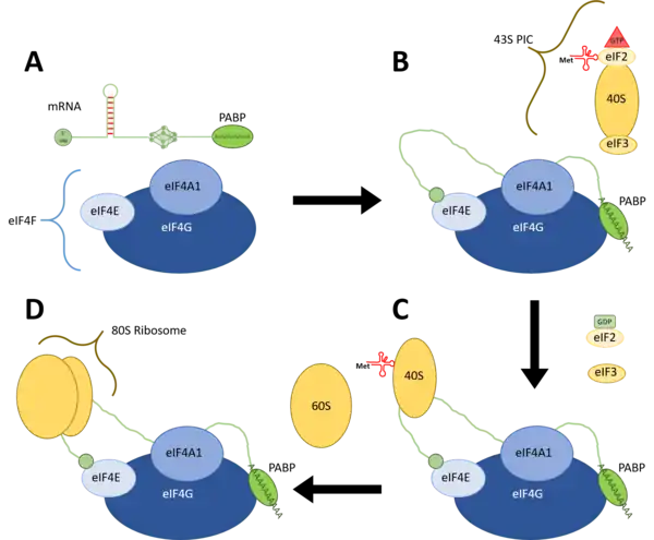 eIF4A1 is a component of the eIF4F translation initiation complex, along with eIF4E, the 5'-terminal cap binding protein, and eIF4G, the scaffold protein that holds eIF4A and eIF4E together.[10] The eIF4F complex is often accompanied by the accessory proteins eIF4B and eIF4H, either of which can differentially enhance the activity of eIF4A1. After mRNA is transcribed from DNA and translocated to the cytoplasm, and the cytosolic PABP is bound to the Poly(A)-tail of the nascent mRNA, its 5'-cap will bind to eIF4E and PABP will bind to eIF4G.[8] eIF4A1 will then unwind the RNA secondary structure from 5' to 3' as the 43S PIC is recruited to the eIF4F complex.[8] The 43S PIC will scan the unwound mRNA from 5' to 3' as well, until it reaches the AUG start codon, whereupon the 60S ribosomal subunit will be recruited to begin the process of elongation.[8]