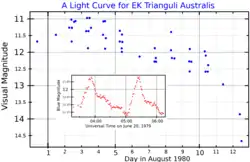 ![]() A light curve for EK Trianguli Australis. The main plot, adapted from Hassall (1985),[1] shows the fading after an outburst. The inset plot, adapted from Vogt and Semeniuk (1980),[2] shows two superhumps. | |