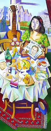 The basic subject of the painting is a woman standing behind a cluttered table of plates, fruit and books, and seen through a doorway (the painting is the shape and size of a door). There is an empty chair next to her and a guitar in between.