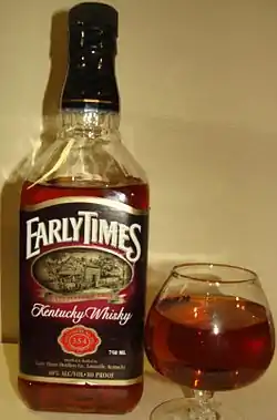 The Early Times Whisky brand production started at Early Times Station, Kentucky,[3] and was introduced in 1860.[4] The Kentucky water surrounding the "Station" was used for making the whiskey. The water naturally filtered through limestone springs. Early Times was not popular until 1920 when Congress passed the Volstead Act and Prohibition began. The brand prospered due to its maker having a license to continue production for medicinal purposes.[3]