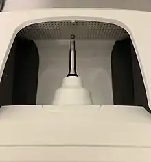 An earmold (also spelled; ear mold, ear mould or earmould) is a device worn inserted into the ear for sound conduction or hearing protection. Earmolds are anatomically shaped and can be produced in different sizes for general use or specially cast from particular ear forms.[1] Some users specify how hard or soft they want their mold to be, an audiologist can also suggest this. As a conductor, it improves sound transmission to eardrums. This is an essential feature to diminish feedback paths in hearing aids and assure better intelligibility in noisy-environment communication. The main goal in wearing earmolds is to attain better user comfort and efficiency. Earmolds (and their tubes) often turn yellow and stiff with age, and thus need replacement on a regular basis.[2] Traditionally, the job of making earmolds is very time-consuming and skillful; each one is made individually in a molding process. However, new digital ear laser scanners can accelerate this process.[3]