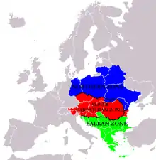 - in the South – Albania, Bosnia and Herzegovina, Bulgaria, Romania, Serbia, the region "overflows towards Belarus and Ukraine" (despite the obvious geographical distance from both)