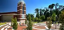 The main campus, also known as the east campus, is about 530 acres (2 km2) in an urban residential area of downtown Greenville. The 158 buildings on main campus comprise more than 4.6 million square feet (325,000 m2) of academic, research, and residential space.[8] Many of the Main Campus buildings feature the Spanish–Mission style architecture; inspiration drawn from Thomas Jarvis' time as an ambassador to Brazil.[19][20] He wanted to bring the unique architecture to eastern North Carolina. On the main campus, there are five districts: Campus Core, Downtown District, Warehouse District, Athletic fields and the South Academic District. On the Campus Core, there are 15 residence halls which are divided into three separate neighborhoods.[21] The distinct feature of the main campus is the mall, which is a large tree–laden grassy area where many students go to relax. In the middle of the mall is the replica of the cupola on the original Austin building.