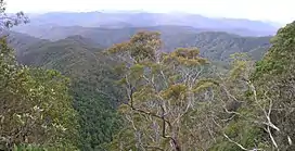 This ecoregion covers an area between Australia's east coast and the Great Dividing Range, starting just above Eden, New South Wales in the South Coast, which includes (parts of) the Blue Mountains to the west Sydney, and ending in south Queensland's Border Ranges.[7] The Sydney metropolitan area is transitional with regions such as the greater west (or the Cumberland Plain Woodland) being virtually excluded from this biome since it predominantly contains dry sclerophyll, grassy woodlands and thus the region's vegetation community will be more similar to Temperate grasslands (i.e. savannahs).[8][9] Though pockets of forested areas in Sydney, such as those in The Hills Shire to the north and Sutherland Shire to the south, which are relatively wet, do have regions within them that are part of Eastern Australian temperate forests (such as the Sydney Turpentine-Ironbark Forest and Blue Gum High Forest).[10][11][12]