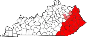 The Eastern Kentucky Coalfield is part of the Central Appalachian bituminous coalfield, including all or parts of 30 Kentucky counties and adjoining areas in Ohio, West Virginia, Virginia, and Tennessee.[3] It covers an area from the Allegheny Mountains in the east across the Cumberland Plateau to the Pottsville Escarpment in the west. The region is known for its coal mining; most family farms in the region have disappeared since the introduction of surface mining in the 1940s and 1950s.