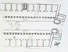 After it was rebuilt in the 4th century, the Eastern gate of Philippopolis had one wide central entrance and two narrower side entrances. Two watch towers were built on both sides of the gate for protection during attacks. The gate was built on the widest and most elaborate street of the city which was partly discovered during the archeological works.[1] The 13 metres wide street was covered with large syenite slabs with paved sidewalk on both sides (each 2.6 m wide) unlike any other street in Philippopolis. Richly decorated colonnade in the Roman Corinthian order was aligned on both sides of the street. Wheel ruts can be seen on the syenite pavement indicating busy cart traffic through the gate. Buildings built in the 4th century with elaborate porticoes in the Corinthian style were found on both sides of the Eastern gate.[2] It is presumed that they were either barracks or infirmary, but their purpose is still debatable. Together with the Eastern gate they formed an entire complex.
