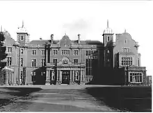 Easthampstead Park is listed by the Department for the Environment as "a building of historic and architectural interest, in Jacobean style with curved gables, pierced stone parapet and stone frontispiece of naive classicism". It was erected in 1864. The pitched roof and the cupolas above the towers were lost sometime between 1936 and present, perhaps following the 1949 fire.