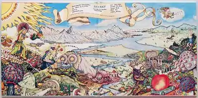 The album includes an elaborate gatefold mural featuring a fantasy landscape of mushrooms (referencing the psychedelic drug, a band favorite in its early days) and fairies, drawn by Powell and J. F. Holmes. There was very little planning involved in the piece, which was created when the duo were in Vero Beach, Florida.[21] When one would be drawing or painting the image, another would be swimming in the ocean. "We swapped off this way with virtually no conversation about the drawing, just fluid trade-offs," said Powell.[21] The art was created on a large illustration board, "on a one-to-one scale—it was the size of the actual spread," according to Powell.[21] Holmes' work is featured largely on the left, with Powell's on the right. Both were "profoundly influenced" by Early Netherlandish painter Hieronymous Bosch on the piece.[21]