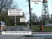 The Ebright Azimuth[4] is located about 6.5 miles (10.5 km) north of downtown Wilmington, Delaware, in far northern New Castle County, within a few feet of the Pennsylvania state line. It is near Concord High School, to the north of Naamans Road, at the middle of the intersection of Ebright Road and Ramblewood Drive. This is an entrance to the Dartmouth Woods development.
