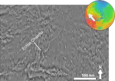 Echus Chasma is approximately 100 km long and 10 km wide, with valleys ranging in depth from around 1 km to 4 km.[1] It is the source region of the Kasei Valles outflow channel, which extends northward from it. It is situated just west of Hebes Chasma, to which it does not connect.