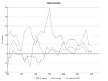 Following the nationalizations in 1979 and the outbreak of the Iran–Iraq War, over 80% of Iran's economy came under the control of the government.[10] After the end of hostilities with Iraq in 1988, the government tried to develop the country's communication, transportation, manufacturing, health care, education and energy infrastructures (including its prospective nuclear power facilities) and has begun the process of integrating its communication and transportation infrastructure with that of neighboring states.[11] It is estimated that Iran sustained a loss of $500 billion through the Iraq war.[12]