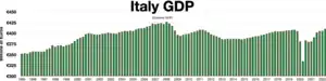 However, the Italian economy of the 1980s presented a problem: it was booming, thanks to increased productivity and surging exports, but unsustainable fiscal deficits drove the growth.[74] In the 1990s, the new Maastricht criteria boosted the urge to curb the public debt, already at 104% of GDP in 1992.[76] The consequent restrictive economic policies worsened the impact of the global recession already underway. After a brief recover at the end of the 1990s, high tax rates and red tape caused the country to stagnate between 2000 and 2008.[77][78]