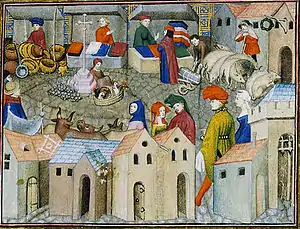 By the 15th century separate ports were established along the river for the delivery of wine, grain, plaster, paving stones, hay, fish, and charcoal. Wood for cooking fires and heating was unloaded at one port, while wood for construction arrived at another. The merchants engaged in each kind of commerce gathered around that port; in 1421, of the twenty-one wine merchants registered in Paris, eleven were located between the Pont Notre-Dame and the hotel Saint-Paul, the neighborhood where their port was located.[29]