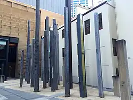 The 29 vertical poles correspond to the 29 Aboriginal clans from around Sydney. As the work is designed not to be viewed from a distance but experienced up close as part of the sensual and spatial encounter, the audience are invited to touch and run their fingers along the engraved names and to feel the textures of the different materials. Walking between the pillars you hear a soundscape of Koori voices reciting the names of places in the Sydney region that have today been swallowed up by the metropolis. This is also a way to celebrate the moment in time.[4][5]
