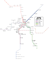 The ETS started operation of the original LRT line in 1978, expanded by 2010 into the Capital Line, running between Clareview in Edmonton's northeast and Century Park in Edmonton's south end.[3] The first phase of the newer Metro Line started service between the University of Alberta campus and hospital in Edmonton's southcentral and the Northern Alberta Institute of Technology northwest of downtown Edmonton in 2015, with further expansion to north Edmonton and neighbouring city of St. Albert planned into the future.[4] Construction of the first phase of the 27-kilometre (17 mi) Valley Line, from downtown Edmonton to Mill Woods in southeast Edmonton, began in spring 2016, and no date has been announced for opening the line. Construction on the second phase of the Valley Line, connecting downtown to west Edmonton, began in fall 2021 and is scheduled for completion by 2027.[6][7][8]