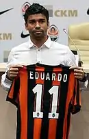 On 21 July 2010, Eduardo signed for Shakhtar Donetsk on a four-year contract for an undisclosed fee, believed to be in the region of £6 million.[32] He made his Ukrainian Premier League debut on 7 August 2010, playing the first half and netting the second goal in a 5–0 win against PFC Sevastopol. Shakhtar and Arsenal were both drawn into Group H in the Champions League, something Eduardo hoped would not happen prior to the draw.[33]