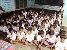 The primary education in India is divided into two parts, namely Lower Primary (Class I-V) and Upper Primary (Middle school, Class VI-VIII). The Indian government lays emphasis on primary education (Class I-VIII) also referred to as elementary education, to children aged 6 to 14 years old.[65] Because education laws are given by the states, duration of primary school visit alters between the Indian states. The Indian government has also banned child labour in order to ensure that the children do not enter unsafe working conditions.[65] However, both free education and the ban on child labour are difficult to enforce due to economic disparity and social conditions.[65] 80% of all recognised schools at the elementary stage are government run or supported, making it the largest provider of education in the country.[66] Figures released by the Indian government in 2011 show that there were 5,816,673 elementary school teachers in India.[67] As of March 2012 there were 2,127,000 secondary school teachers in India.[68] Education has also been made free[65] for children for 6 to 14 years of age or up to class VIII under the Right of Children to Free and Compulsory Education Act 2009.[69] While school enrollment rates have increased, many children leave school with poor literacy and numeracy skills. ASER reported in 2019 that only 50% of fifth standard students in rural India could read a Standard II-level text, and only 29% of them could do basic division.[70]