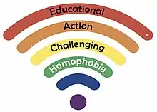 Educational Action Challenging Homophobia (EACH) is a charity based in the United Kingdom which "affirms the lives of lesbian, gay, bisexual and trans (LGBT) people and reduces discrimination experienced because of sexual orientation or gender identity."[3] Since 2003, EACH has delivered training and consultancy services on sexuality and gender identity matters across the statutory, voluntary and private sectors. It also provides support to those affected by homophobic, biphobic or transphobic bullying through its nationwide, freephone helpline.[4]