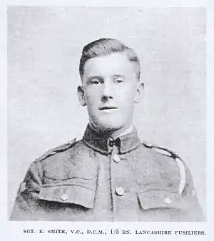 On 10 August 1918, then a Corporal with the 1/5th Battalion, Lancashire Fusiliers, Smith was leading a daylight patrol near Hébuterne in the Somme Area of France to examine points in the German lines where information was required. As the patrol was about to retire, he saw a party of about 40 Germans about to take up outpost duty. Despite being heavily outnumbered by the German soldiers, Smith led his small party of men and engaged the enemy, breaking up the German party and causing severe casualties. As well as receiving the Distinguished Conduct Medal for this action, he was promoted to the rank of Lance Sergeant.