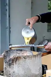 Egg waffles are made from a sweet, egg-rich batter that is cooked on a hot griddle, a special frying pan with small round cells (resembling an æbleskiver pan but with a higher number of smaller round cells). The griddle is set on hot coals in the fire, or more commonly on an electrical heater. The batter is poured over the special frying pan and heated; the small ovals of egg waffles are thus formed. The crucial key to prepare a crispy egg waffle is to turn over the pan quickly after the batter is poured into the hot frying pan. This could create an egg waffle that is crispy on top, and cake-like on the bottom.[7] The waffle is also crispy on the outside with each bubble providing a fluffiness on the inside.[8] In addition to the conventional "egg taste", they are also available in a variety of flavours such as chocolate, green-tea, ginger, etc. Most batters used in egg waffle are quick breads, although some are also made using a yeast-raised or fermented batter. Egg waffles can be eaten at different times of the day, depending on local tradition.