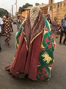 Cloth plays an important role in the world of the Yoruba. Their beliefs equate nakedness with infancy, insanity, or the lack of social responsibility.[7] More elaborate dress reflects social power and prestige. In performances honoring ancestors, exquisite cloth is the major medium for the masker's transformation. An Egungun costume is composed of multiple layers of cloth lappets made from expensive and prestigious textiles, expressing the wealth and status of a family as well as the power of the ancestor.
