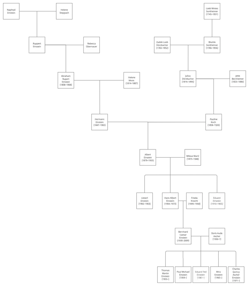 | 7th | Hermann Einstein (1847–1902). Siblings: August Ignaz Einstein (1841–?), Jette Einstein (1844–?), Heinrich Einstein (1845–?), Jakob Einstein (1850–?), Friederike Einstein (1855–?) | Pauline Koch (1858–1920). Siblings: Fanny Koch (1852–1926), Jacob Koch (?), Caesar Koch (?) | |