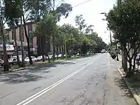 The system of ejes viales (singular: eje vial, lit. "road axis") in Mexico City is a large network of wide arterial roads with coordinated traffic signals. They are mainly directed in one-way with a single lane going in the opposite direction used exclusively by public transportation. The network was a project of Mexico City mayor Carlos Hank González and the first part of the network, after extensive construction and demolition of buildings and removal of trees, opened in 1979.[1] With the exception of the Eje Central, a south-to-north eje passing through the historic center of Mexico City, the ejes are numbered with cardinal directions, for example going north from the center: Eje 1 Norte, then Eje 2 Norte, and so forth. In addition to the Eje number and directional, the streets retain their individual names, with one eje thus consisting of multiple sequential individually named streets.