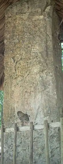 East Plaza Structure 2 is also on the east side of the plaza.[20] It is a rectangular platform measuring 17 by 10 metres (56 by 33 ft) and facing westwards onto the plaza itself.[75] A stairway climbs the west side of the building. It measures 12 by 1.2 metres (39.4 by 3.9 ft).[75] The platform supports a bench measuring 12 by 3 metres (39.4 by 9.8 ft).[75] The broken remains of Stela 6 are scattered in front of the structure.[75] Relatively few ceramic remains were found associated with this structure. Those that were have been dated to the Terminal Classic, although a pit sunk into the summit uncovered remains dating to the Late Classic at a depth of 1 metre (3.3 ft).[76] Lithic artefacts included a piece of an obsidian knife.[76]