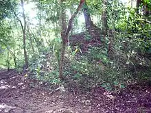 West Plaza Structure 4 is on the west side of the West Plaza and is the tallest structure at El Chal.[84] The platform measures 46 metres (151 ft) north-south and 30 metres (98 ft) east-west;[84] it has a rectangular base that was formed of three stepped sections.[85] The lowest section measured 1.83 metres (6.0 ft) high with a 1.3 metres (4.3 ft) wide platform between its upper edge and the beginning of the second section.[77] The middle section was 1.2 metres (3.9 ft) high with a 0.6-metre-wide (2.0 ft) platform between its upper edge and the base of the upper section.[77] The wall of the top section is poorly preserved with just two courses of stonework remaining in place.[77] The sides of the structure have largely collapsed due to erosion, leaving the north side as the best preserved.[77] The stairway has not been positively identified but is believed to be a wide sunken stairway on the east side.[84] The broken fragments of Stela 1 were found at the base of this stairway.[86]