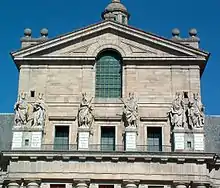 The main entrance of the El Escorial is the west façade, which has three doors: the middle one leads to the Courtyard of the Kings (Patio de los Reyes) and the side ones lead to a school and to a monastery. Above the center door is a niche where the image of Saint Lawrence has been placed.[19] The Courtyard of the Kings owes its name to the statues of the Kings of Judah that adorn the façade of the Basílica, located at the east end of the courtyard. Steps of red marble lead to the large, public chapel, past the narthex, with is one of the highlights of the basilica. The basilica has a floor in the shape of a Greek cross and an enormous dome, inspired by St. Peter's Basilica in Rome, above the crossing.[20] The naves are covered over by barrel vaults decorated with frescoes by Luca Giordano. The main altarpiece is 30 metres (98 ft) high and divided into compartments of different sizes where are found bronze sculptures, and canvases painted by Tibaldi, Zuccari, and Leoni. In the sacristy, paintings such as Joseph's Coat by Velázquez, The Last Supper by Titian, and The Adoration of the Sacred Host by Charles II by Claudio Coello are on exhibit.
