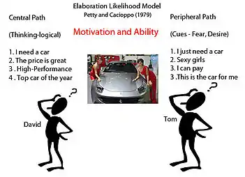 The elaboration likelihood model (ELM) of persuasion[1] is a dual process theory describing the change of attitudes. The ELM was developed by Richard E. Petty and John Cacioppo in 1980.[2] The model aims to explain different ways of processing stimuli, why they are used, and their outcomes on attitude change. The ELM proposes two major routes to persuasion: the central route and the peripheral route.