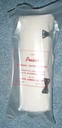 An elastic bandage is a "stretchable bandage used to create localized pressure".[1] Elastic bandages are commonly used to treat muscle sprains and strains by reducing the flow of blood to a particular area by the application of even stable pressure which can restrict swelling at the place of injury. Elastic bandages are also used to treat bone fractures. Padding is applied to the fractured limb, then a splint (usually plaster) is applied. The elastic bandage is then applied to hold the splint in place and to protect it. This is a common technique for fractures which may swell, which would cause a cast to function improperly. These types of splints are usually removed after swelling has decreased and then a fiberglass or plaster cast can be applied.