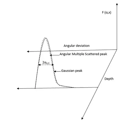 In the below figure there is a considerable difference between in the shape area of Gaussian peak (ideal condition) and angularly deviated peak.[49] and α is an angle due to angular deviation of a penetrated ion beam through matter.