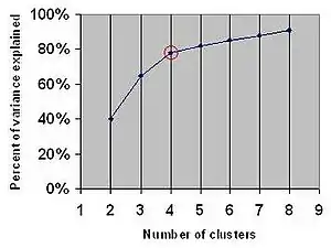 There are various measures of "explained variation" used in the elbow method. Most commonly, variation is quantified by variance, and the ratio used is the ratio of between-group variance to the total variance. Alternatively, one uses the ratio of between-group variance to within-group variance, which is the one-way ANOVA F-test statistic.[3]